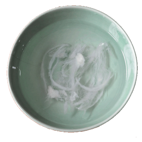 有稍可见或平纤维的燕窝代表着经过过多加工,而过多加工可降低燕窝原状、梅素和营养价值。(图右下)