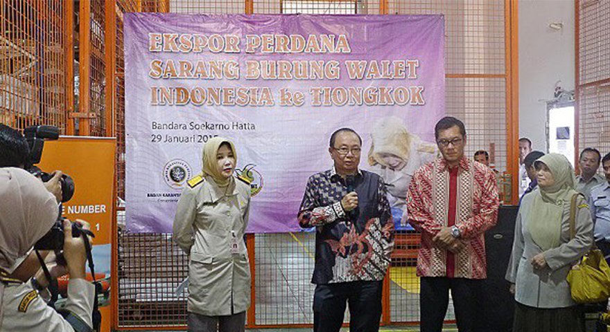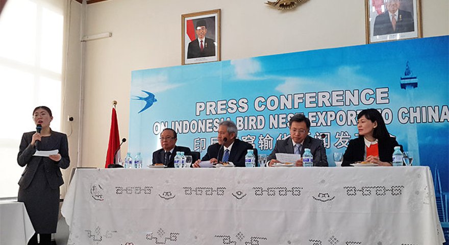 在北京举行的印尼燕窝输华新闻发布会 新闻发布会中(由左而右) :Boedi Mranata、印尼驻华大使 Soegeng Rahardjo, 中国国家认证认可监督管理委员会主任Gu Shaoping 、中国检验检疫科学家研究院副院长Li Li