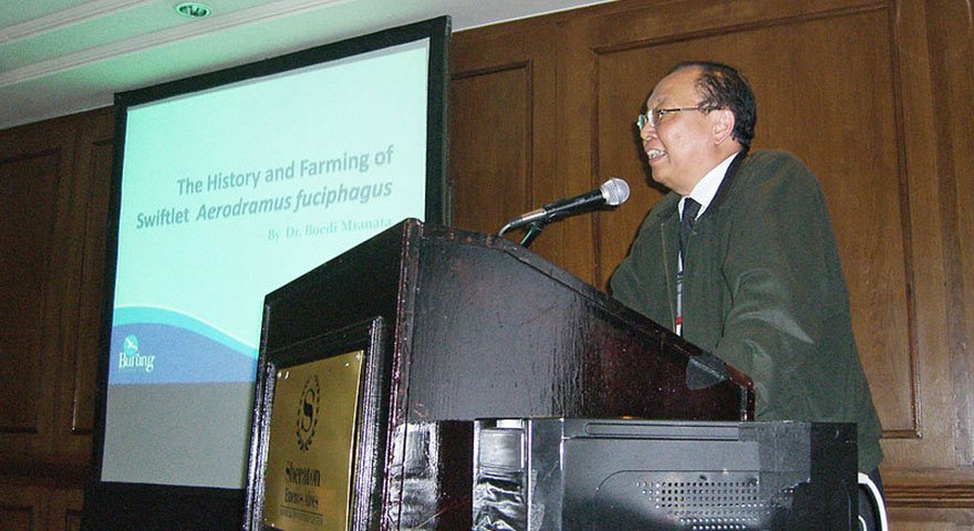 燕窝讨论会 Boedi 为印尼小鸟生活代表人在阿根延布宜诺斯艾利斯举行的世上最大燕窝业讨论会做养燕技术的演讲